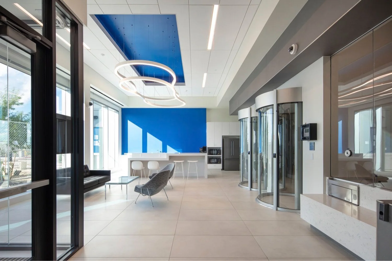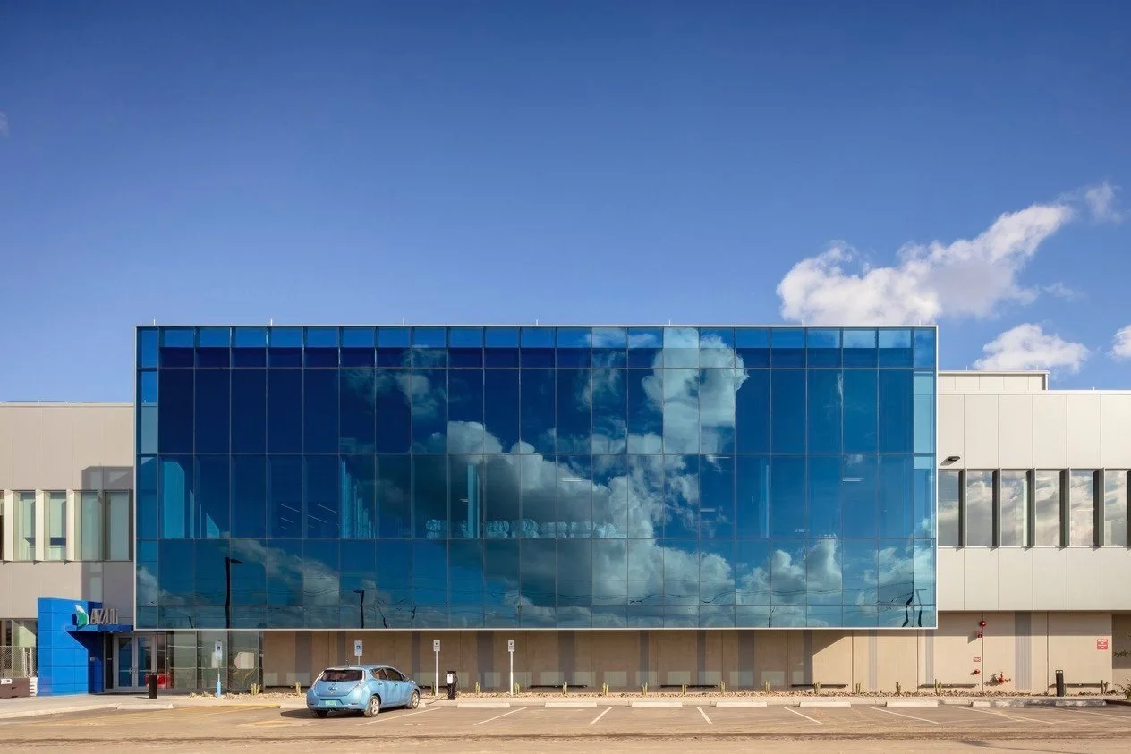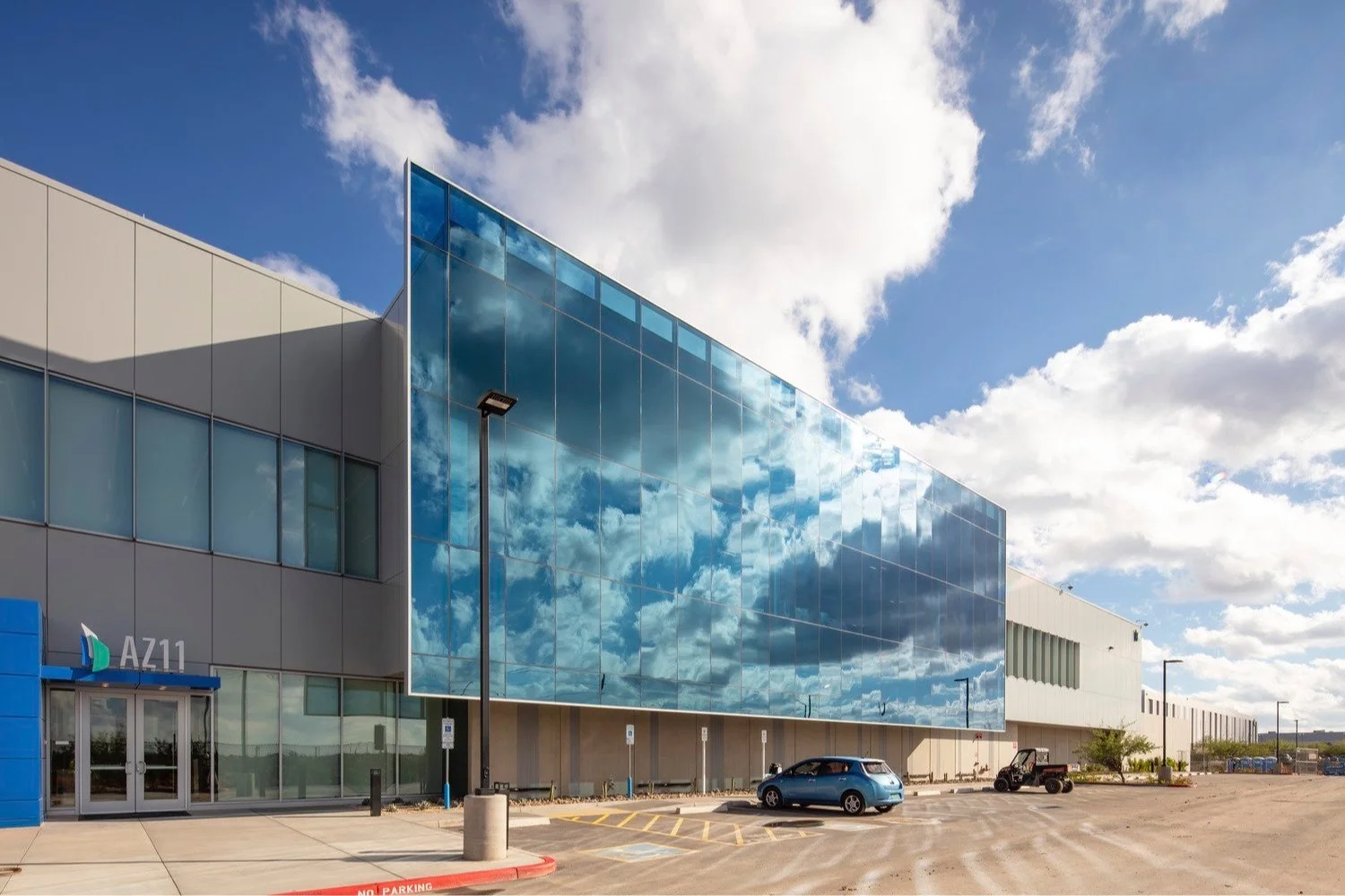 The two-story building is the first build on the AZ1 campus and offers client’s top of the line security and amenities for people to focus as well as to recharge. The design aims to create a unique world class design that stands out while fitting into the aesthetic established by the Global Branding Guidelines. The buildings is composed of simple materials of formliner embedded tilt-up concrete panels, clear vision glazings, monolithic vision and spandrel blue glazing, and metal panels. These materials playfully interact with one another in a series of intersecting and protruding planes.