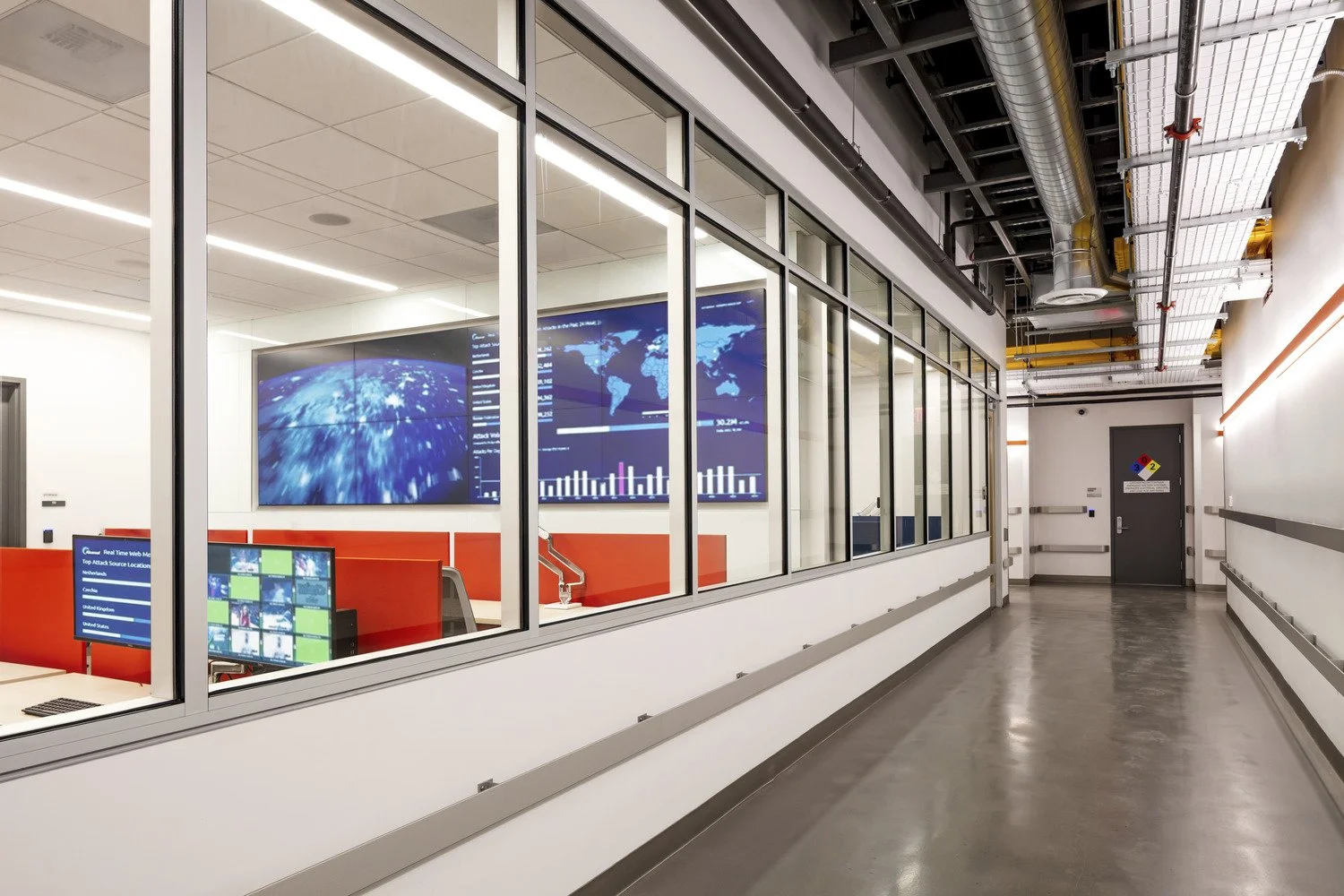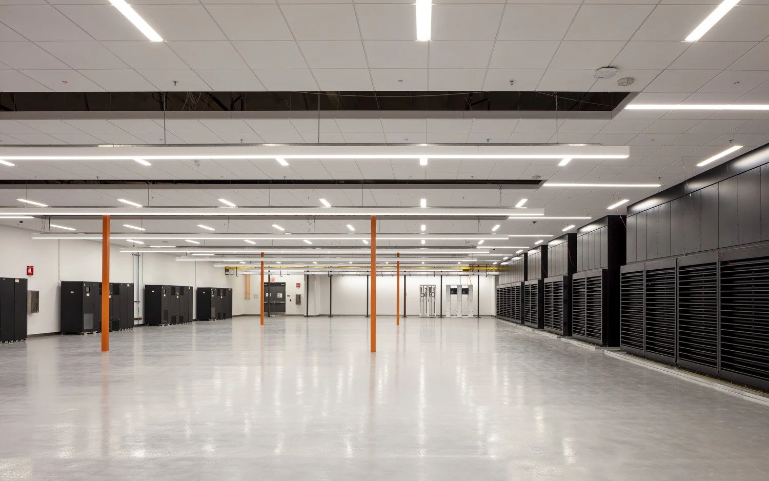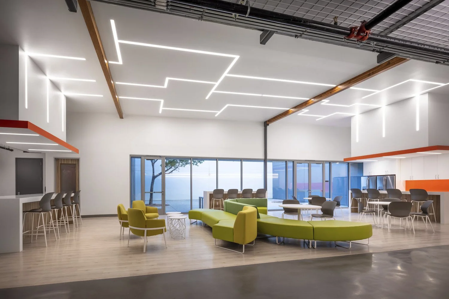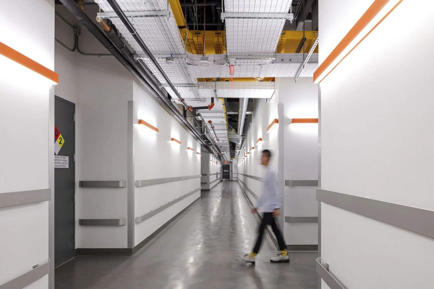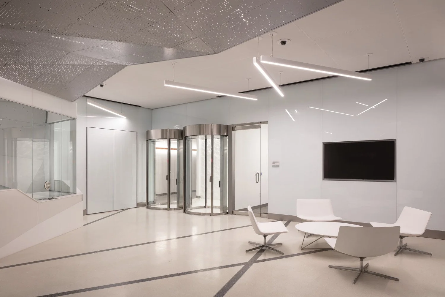 This adaptive-reuse project is exemplary in its creative approach to sustainability by reappropriating a long vacant building from the 1980’s to serve as a state-of-the-art data center. The design team reinforced the existing structure and tied it into new rooftop mechanical equipment dunnage that covers most of the building to increase the structural importance factor to 1.5. The front entry and lobby were enhanced to denote access into a high-tech space. The main communal area located just past the secure lobby celebrates the intersection of new and old by exposing the existing structure below an LED lighting design that is reminiscent of a circuit board. Orange accents are located throughout the communal and office area, as well as in the wall mounted lights that line the corridors to reinforce the client’s brand identity. Floor to ceiling windows at the lobby and adjacent an existing internal break room courtyard invites natural light to the far reaches of the space. In the theme of green reuse, the building's mechanical system utilizes a refrigerant cooling system that uses significantly less energy and no water given that the surrounding area is prone to frequent droughts.